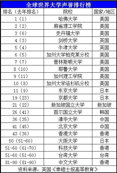 2014年3月5日,《2014泰晤士报高等教育》周刊世界大学声誉排名新鲜出炉。前十名的学校毫无悬念地被英美所垄断,哈佛大学仍然高居榜首,麻省理工以90.4的评分紧随其后;亚洲排名最高的为东京大学,得分为27.7,该校同样也是非英美高校的第一名,亚洲高校共有17所进榜,其中中国高校有6所;相比于去年,清华大学下降一名排在全球第36位,而北京大学则升至41位。