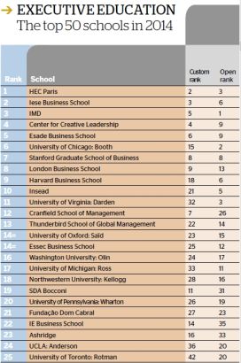 在这份榜单中,排名前十位的学校依次是:巴黎HEC商学院、西班牙IESE商学院、瑞士IMD商学院、创新领导力中心(简称CCL)、西班牙ESADE商学院、芝加哥大学商学院(Booth)、斯坦福商学院、伦敦商学院、哈佛商学院和INSEAD商学院。