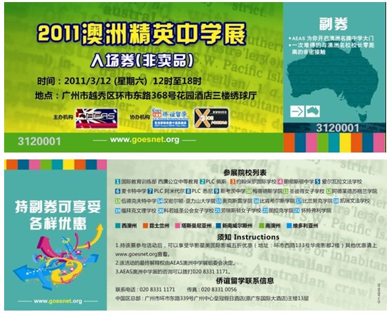 侨谊留学、x-voice电台将陆续于广州地王广场、越富广场、文昌购物广场、光明广场、动漫星城、万国广场、康王假日广场、康王商业城、中华百货、恒宝广场等多家知名大型购物广场推出AEAS澳洲精英中学展免费送票活动。持入场券的同学可于3月12日当天免费参加AEAS澳洲精英中学展,感受来自澳洲精英中学的国际教育冲击,副券更可多次享受购买华南影都电影票五折优惠。