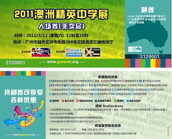 持入场券的同学可于3月12日当天免费参加AEAS澳洲精英中学展,感受来自澳洲精英中学的国际教育冲击,副券更可多次享受购买华南影都电影票五折优惠。